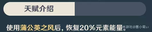 分析:突破等级4后解锁的固有天赋。释放元素爆发后为琴恢复16点元素充能,使琴能够更快速的释放元素爆发。