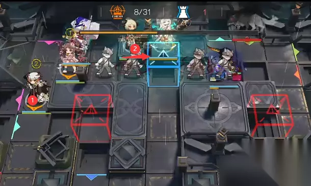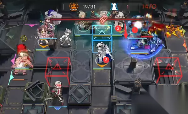 2.打法流程 如下图所示位置部署桃金娘产费,随后部署艾雅法拉(向下)→ 浊心斯卡蒂 → 棘刺(向右) 棘刺和桃金娘技能都是好了就开。