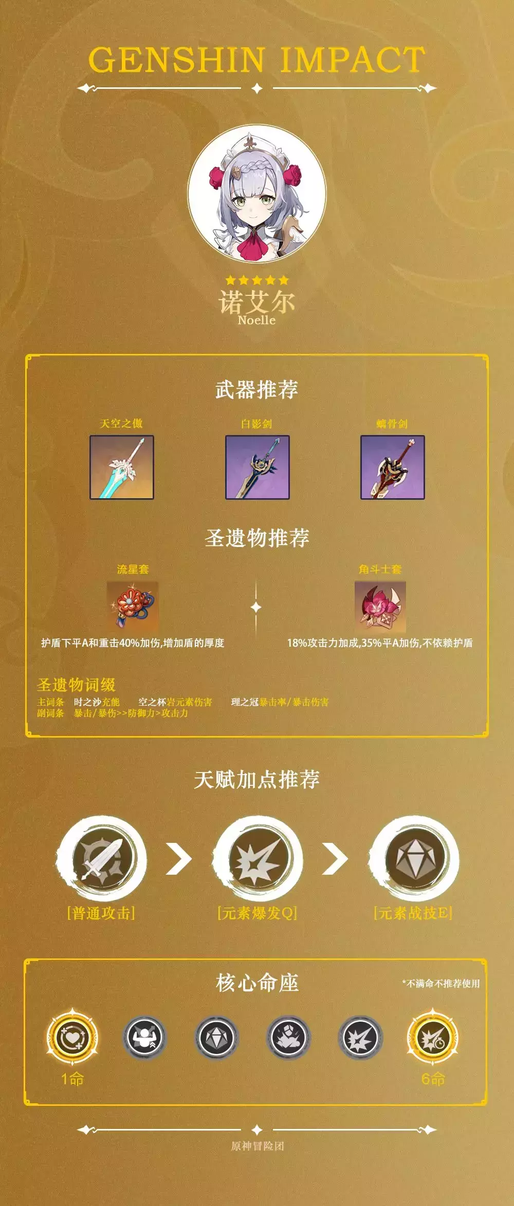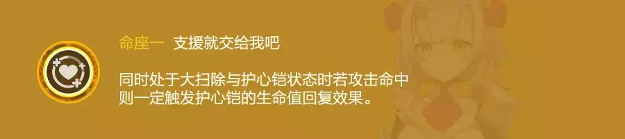 辅助关键命之座,开Q开E下每次普攻或重击都能全队回血,很实用的命座。如果目标就是为了回血的话,此时可以考虑使用重击,回血速度会快一些。如果诺艾尔是无情的套盾工具人的话1命就足够了。