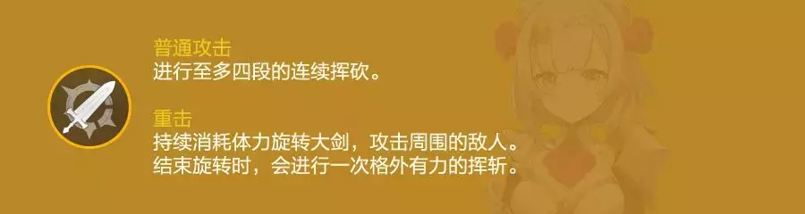 诺艾尔的普通攻击为四段,前三段为攻击范围较广的横扫,第四段为面前前方直线的下劈。而其重击则是转圈圈。这个转圈在大招加持下有着较大的范围,但本身限制较多,需要消耗体力并且怕打断,只推荐带流星套时偶尔使用重击,平时不使用重击。主要输出方式还是普攻。