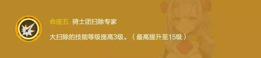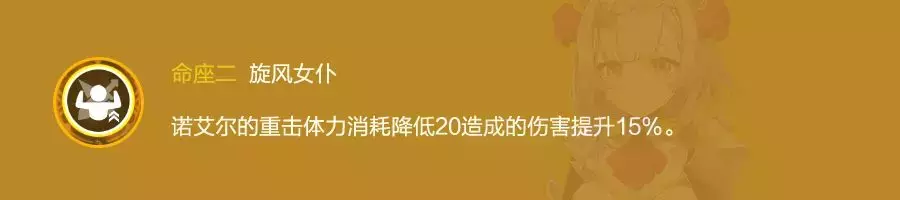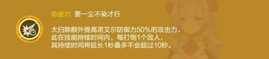 输出关键命之座,提升大招防御力转化攻击力的百分比,开Q时每击杀一名敌人持续时间增加一秒,最多增加10秒。诺艾尔的核心命座,决定了其属性收益,提升了大招覆盖率。在目前的环境下诺艾尔只有6命才有作为主C培养的价值。