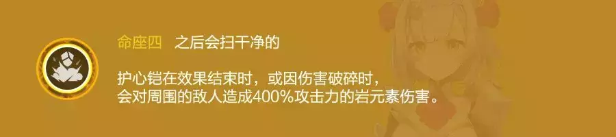 E护盾消失时(自动消失或者被打破)会基于当前攻击力造成400%攻击力的岩伤。开大状态下炸盾伤害还不错。