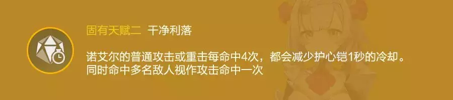 普攻或重击每命中四次,E的CD减少1秒。这个天赋主要是为解决诺艾尔E护盾真空期过长的问题,但依然无法做到护盾无缝覆盖。