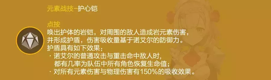 召唤护盾,当诺艾尔在此护盾下普攻或重击命中时全队回血,伤害吸收量基于诺艾尔防御力。护盾切人不消失,持续12秒CD24秒。这个技能在释放时也会产生岩元素伤害,而在护盾消失时则会基于当前攻击力造成400%攻击力的岩伤(4命)。这个技能能保证诺艾尔稳定的的输出环境,但需要注意的是该技能真空期不短,无法做到无缝的护盾覆盖,要对战场情况进行灵活的应对。