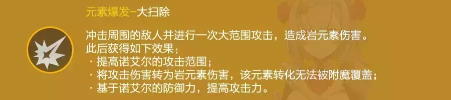 进行横扫,并基于防御力提高攻击力,普攻(包括重击和下落攻击)岩元素附魔,这个岩元素附魔不会被其他元素覆盖。大招是诺艾尔输出的资本,也是实战中尽可能保证永续的关键buff。它决定了满命诺艾尔的防御力收益高于攻击力,并且在实战时有着较高的攻击力面板。