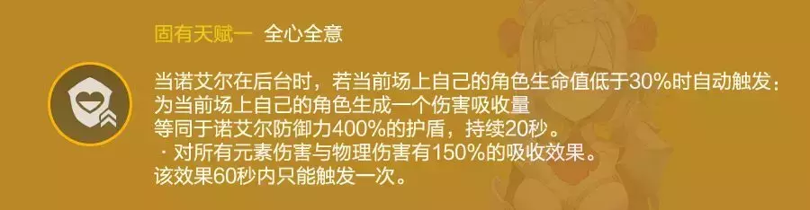 当诺艾尔处于团队后台时,当场上角色血量低于30%时触发,生成一个基于诺艾尔防御力的护盾,冷却60秒。这个天赋保证了当诺艾尔不在场上时其他角色的生存能力,但依旧需要注意的是如果角色直接被秒这个护盾是无法产生的。