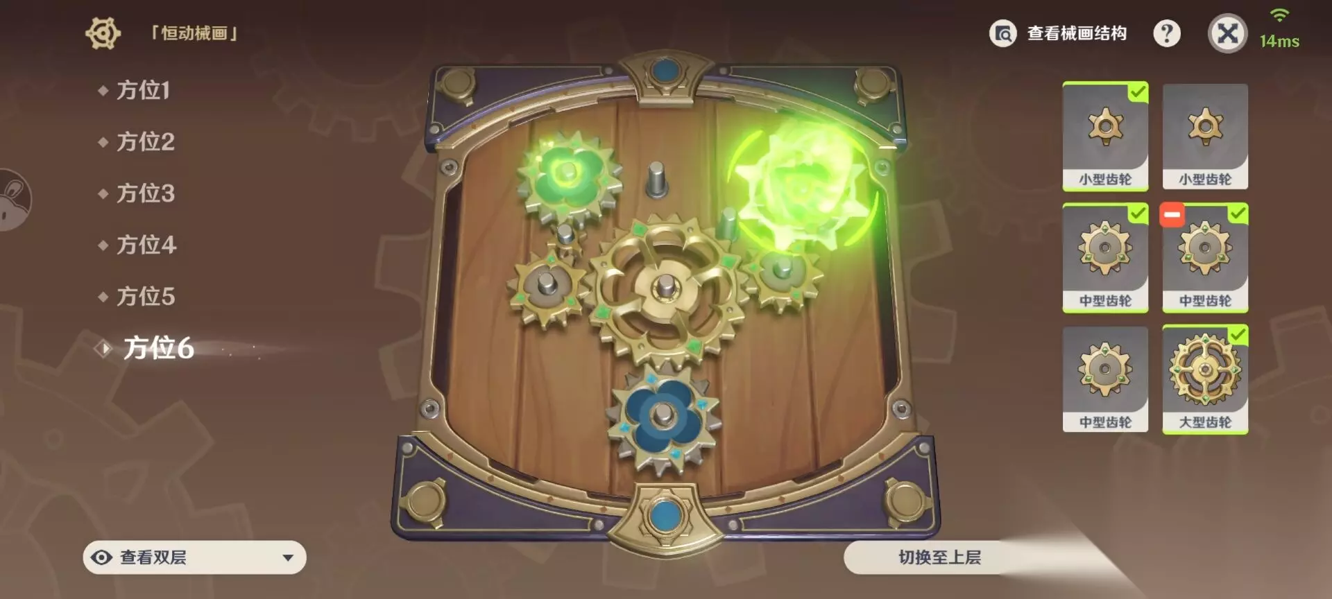 方位1 下层 中型齿轮 方位2 下层 小型齿轮 方位4 下层 大型齿轮 方位6 下层中型齿轮 如下图即可