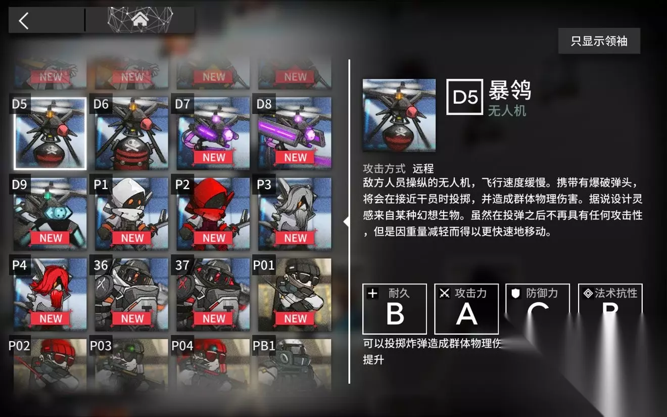 棘手的地方在于空战,没有足够多数量的狙击干员的话,无法第一时间清理的所有的无人机(容易漏怪)。而地面战相对会简单很多,只要放置三个干员进行阻挡即可。 (2)敌军信息 飞行单位:妖怪MKII(D2)、暴鸰(D5) 无人荒楼中D2无人机是本关空战线出现最频繁的单位,但血很薄,所以问题不大。 最大威胁在于D5无人机,暴鸰是带有导弹的,没有在第一时间清理掉,只要一个飞弹过来,周围3个狙击干员都要遭殃! 暴鸰在登场时候会在场上稍微停留下再行动,推荐使用快速狙或者超远狙来快速清理,或者直接在地图第一个部署快速复活干员“骗炮”。
