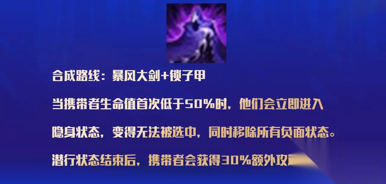 在新版别中配备也有所改动,许多配备的特点都有所调整,其间改动最大的便是复生甲了,复生甲在全新的版别傍边叫做夜之刀锋,与复生甲比较增加了许多的正面收益,组成途径依旧是大剑和锁子甲。