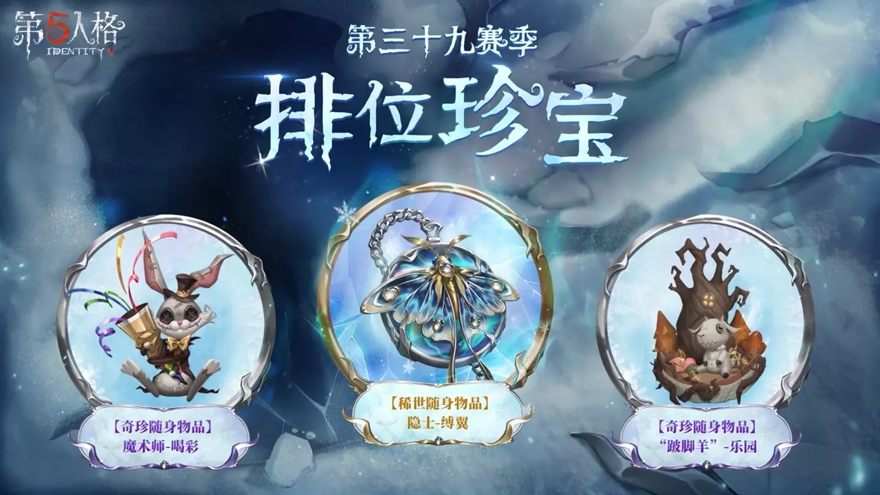 《第五人格》第三十九赛季排位珍宝情报公布,包含隐士稀世随身物品缚翼、“跛脚羊”奇珍随身物品乐园、魔术师奇珍随身物品喝彩的三视图,玩家可查看详情。