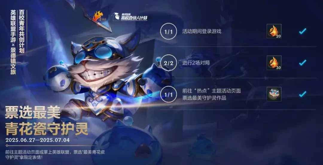 此外,召唤师可前往【热点】参与“票选最美青花瓷守护灵”活动,完成每日投票还可获得龙魂水晶*10作为奖励,首次在掌上英雄联盟APP内完成1次作品投票还可额外获得青花瓷限定局内表情-别夸。