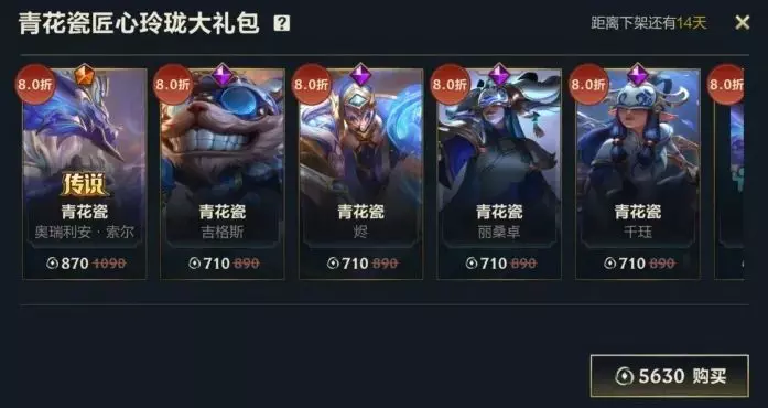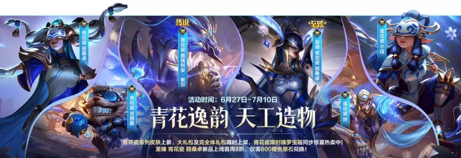 即日起,截止至7月10日23:59,召唤师可前往商城,使用5630点券获取青花瓷匠心玲珑大礼包!礼包内包含8折优惠的传说皮肤-青花瓷 奥瑞利安·索尔、青花瓷 吉格斯、青花瓷 烬、青花瓷 千珏、青花瓷 丽桑卓共5款新皮肤及精英姿态-青花曲,还包含对应皮肤姿态、皮肤边框和个性化道具等5折好礼~
