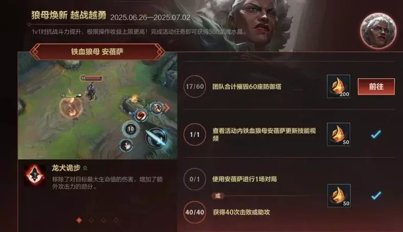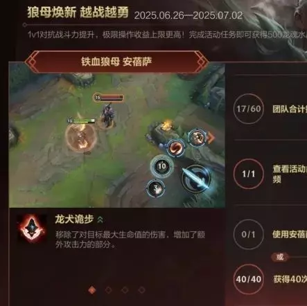 铁血狼母 安蓓萨重做登场!截止至7月2日23:59,召唤师完成活动任务即可获得龙魂水晶*500好礼。