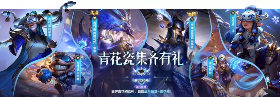 召唤师集齐“青花瓷 古意”系列皮肤,还可领取战斗纹章-青花瓷,让你在峡谷展现独特国风排面!