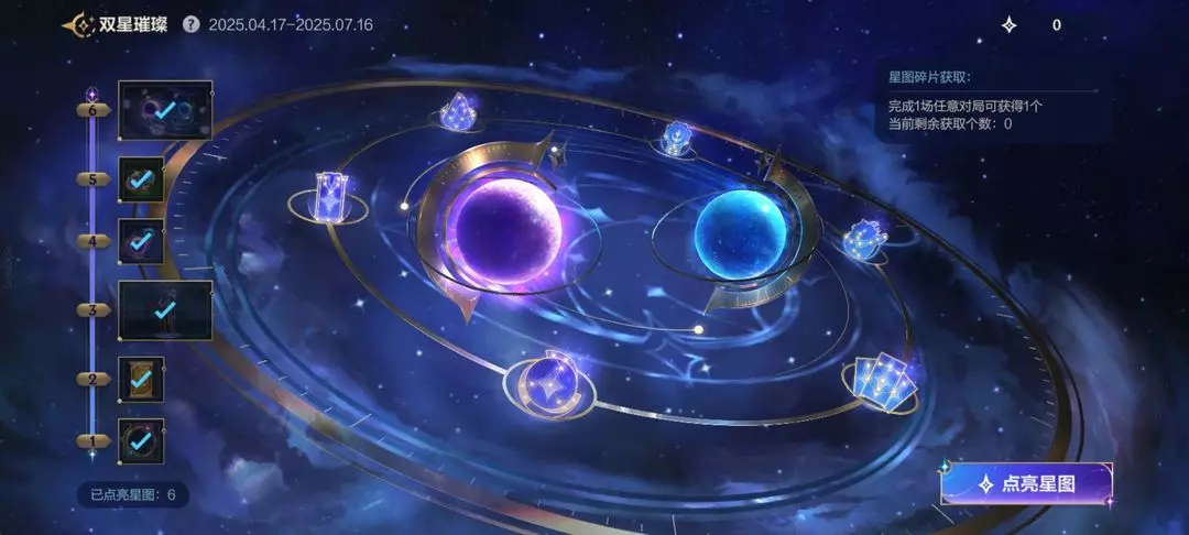 每张星图完全点亮需消耗10个星图碎片,只有在星图完全被点亮后,才可解锁专属奖励。建议召唤师在完全点亮单个星图后,再去点亮下一个星图,可以更早获得奖励哦!奖励仅在“双星璀璨”版本主题期内领取,大家记得及时领取~