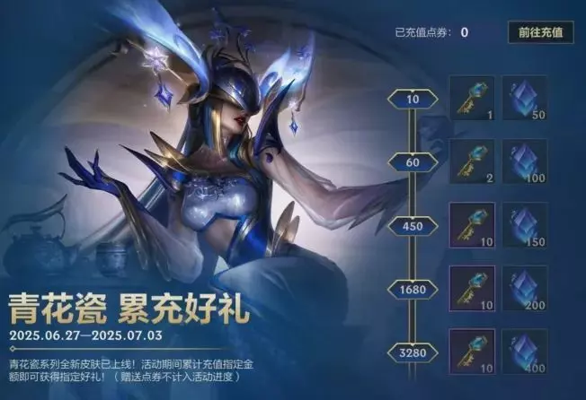 即日起,截止至7月3日,召唤师累计充值达到指定数量即可领取对应的殿堂珍藏道具随机宝箱、水晶秘钥、集萃原矿奖励!