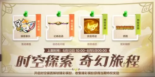 全新个性化道具收集活动“时空探索 奇幻旅程”火热进行中。截止至8月5日,召唤师参与活动即有机会获得局内动态表情-接着奏乐、名片框-幻森名函等超多精美个性化道具~