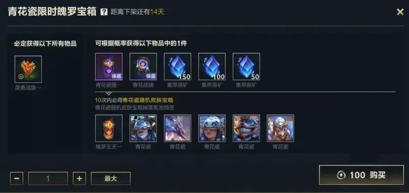 此外,青花瓷限时魄罗宝箱也在同步热卖中!即日起,截止至7月10日23:59,召唤师使用100点券开启宝箱,即可获得英勇战旗-金牛战旗(1天),还有机会获得青花瓷随机皮肤宝箱、青花瓷限定英勇战旗-青花战旗和集萃原矿好礼~