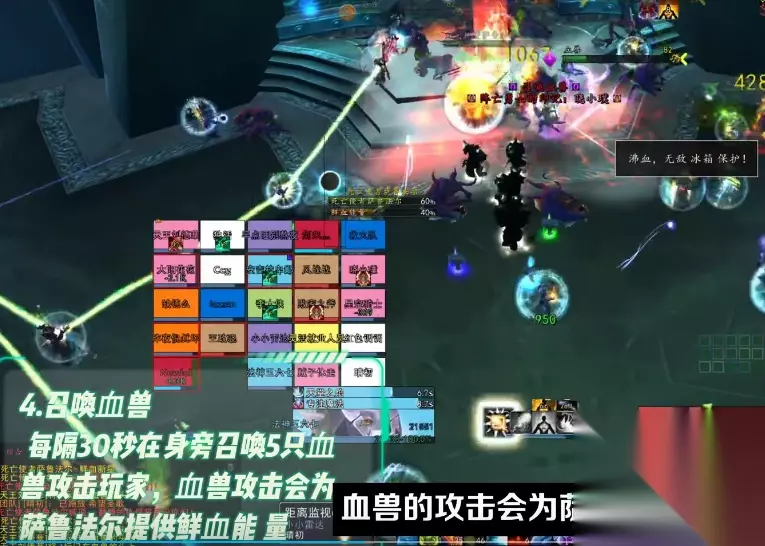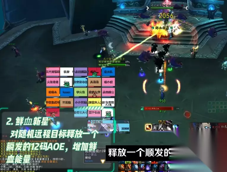 BOSS技术介绍 一技术欢腾之血:每15秒对随机一名玩家上低buff,每3秒形成一次物理损伤并添加鲜血能量,继续15秒。这个技术会给boss添加鲜血能量。