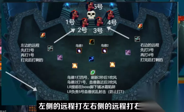 六技术狂怒:当boss的血量降至30%时敞开狂怒,进犯速度进步30%,此刻大团敞开嗜血rush吧,坦克需求看状况伤医治刷印记的压力也会更大,奶妈往死里奶吧。 战术组织 首先是大团有必要提早分配好站位,大约的思路如下图所示。两个坦克拉住boss原地背对长途,围成一个扇形,12码涣散医治站在大团中心,尤其是奶骑,一定要确保能刷到一切人的血。只需站位分好了,那么最大的难点便是怎么安全快速的击杀血兽了。25人的血兽一共有5只,改写的方位是固定的如上图所示。
