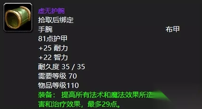 法系输出这款虚无护腕而言,除了没有插槽就看不出一丁点毛病了,高额耐力与智力双管齐下,既保证了你的生存又给予了续航的保障,29点的法伤虽然谈不上恐怖如斯四个大字,但是也足以让你看上去足够强力了。