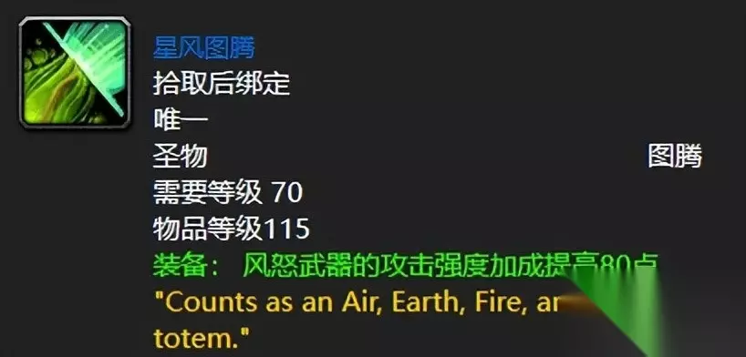 法力陵墓BOSS潘德莫努斯出品的星风图腾,可以说是前中期增强萨必肝的了,第四阶段之前都是直接毕业的存在。其恐怖如斯之处我想只要是个玩萨满的都应该懂吧,当然如果你不玩增强萨的话就当喵叔我没说。