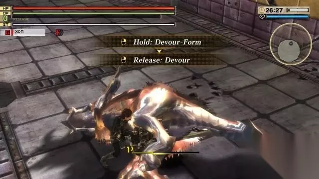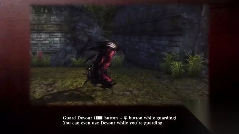 step3.然后是学习使用吞噬模式,按住鼠标右键进入吞噬模式,当蓄力足够以后,松开鼠标右键对敌人进行吞噬。 最好是先锁定敌人,并且近距离对敌人发动吞噬。 击倒敌人之后,按E键拾取地上的战利品。