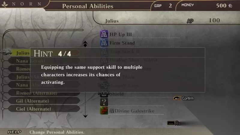 同伴房间 当技能系统开启时,你的同伴可以在任务之后激活他们的支援技能。 这些技能能够在完成任务或者是打破契约来获取,这些技能的效果都很有用。 在终端机按Ctrl键可以查看每个角色个人能力。 更多关于支援技能的信息可以在终端机的信息中心内查看得到。 在这里你可以查看并更改队伍当中的成员的个人技能。 学习心得技能是需要消耗AP或GAP。 AP能够在带领同伴去执行任务或者是让他们充当支援者来获得。 一次过可以启动4项个人能力。而在任务完成后,支援技能就会激活。 不同角色装备同样的支援技能能够增加技能激活的激活。