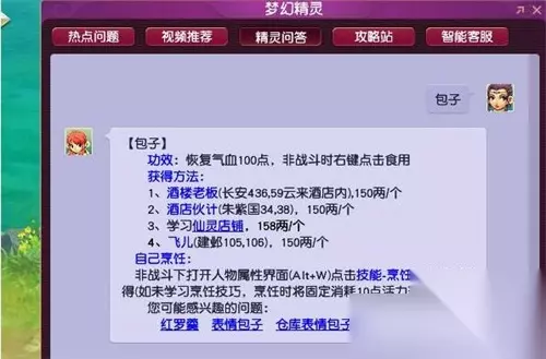 梦幻西游包子在哪买 1、在长安城436,59坐标的云来酒店内向酒楼老板处购买,价格是150两一个; 2、在朱紫国34,38坐标的酒店伙计处购买,价格是150两一个;