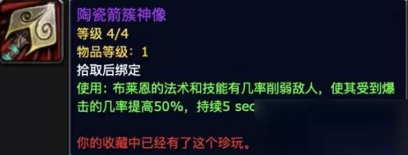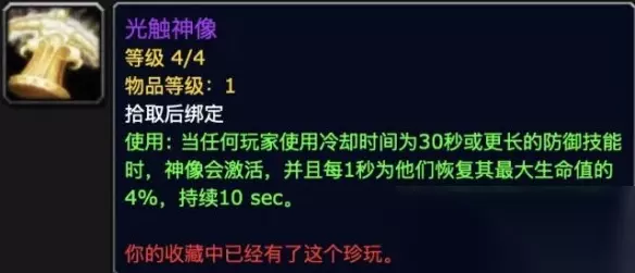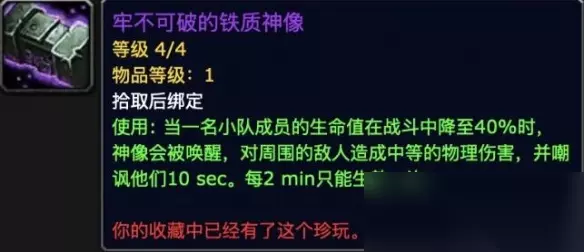 主治疗副坦克 1、战斗珍玩:牢不可破的铁质神像 2、效能珍玩:流变圣物 选择牢【不可破的铁质神像】主要是为了给布莱恩添加一个AoE嘲讽的手段帮助玩家更好的单刷地下堡; 高层地下堡小怪集群战时残血喝几瓶血瓶也可帮忙转移仇恨。
