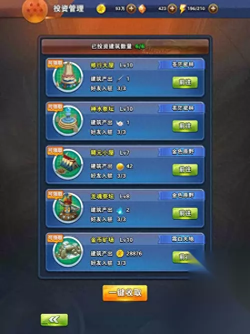 【建筑分类】 龙珠大冒险中,玩家可以投资的建筑有修行大屋、神水祭坛、精元小屋、龙魂祭坛、金币矿场、圣水温泉6个。建筑升级需要消耗星星,星星的获得途径是通过冒险和英雄副本累积。每个建筑升级到指定等级后,可以让好友入驻,好友的战力越高,获得的加成百分比越多。