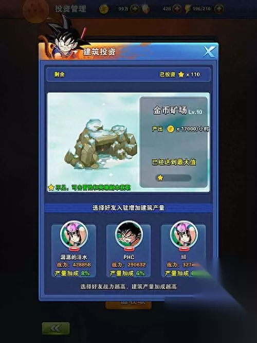【不同级别建筑产出】 不同等级的建筑,每小时产出的材料数量是不同的。3级的金币矿场每小时产出1万金币,10级金币矿场每小时产出1.7万金币。17万战力的好友加成是2%;20万战力的好友加成是4%;30万战力好友的加成是6%;40万战力好友的加成是8%。可见,不同等级和好友战力的建筑,每天所产生的金币数量差异还是非常大的。