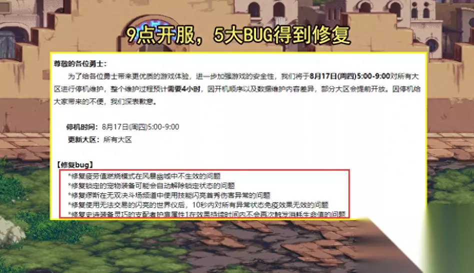 首先,在8.17版本将有5处BUG得到修复,对于这5个BUG的修复,对玩家有利的主要有2处。一处是风暴幽城疲劳值燃烧不生效的问题,修复后,由于加百利会出现3个道具,更适合时间少,但喜欢摸金的玩家。