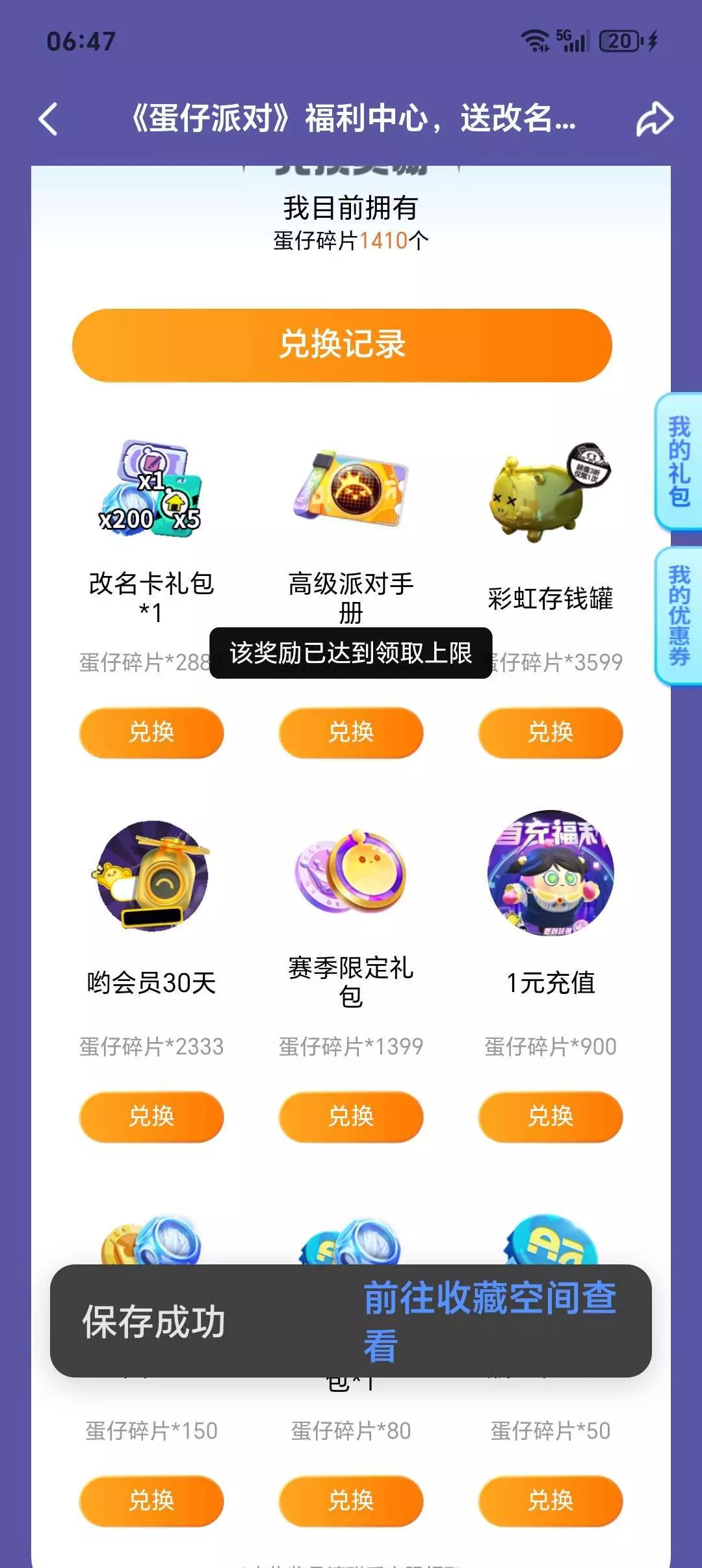 也不知道谁哈放一大堆图片在那诱惑我攒了1000多,准备兑换一下呢,兑换已达上限,不是啊,我没有兑换过呀,不是兑换不了,下架了你就放下去啊,你把图片晾上干啥?害得我攒了这么久😂 我没有攒齐的时候,你说蛋仔碎片不够,攒齐了,你说兑换已达上限啊?啊!?说话look my eyes