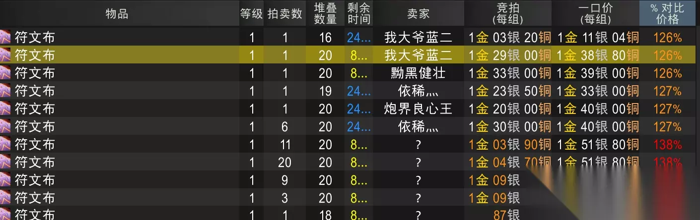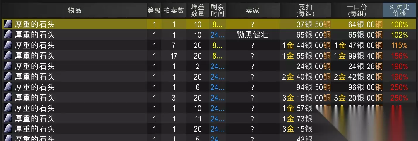 厚重的石头 可以看到石头的供应量没那么大,一组价格1.2g--4g不等,我们按照这个卖家2g一组算(他供货量大) 也就是192g,也是接近200g 最后的总结 通过实地测算,考虑到供货量和价格等因素,兑换暗月宝珠/护符,最靠谱的兑换方式是 通过瑟银零件和致密砂轮来兑换 如果不想麻烦直接买成品,AH直接买零件 你需要买36组瑟银零件(零件10个一组)或者是24组致密砂轮,当然你也可以混买。这些总花费约450g 如果你想省点,可以买原料让朋友代做 那你需要购买54组瑟银锭和18组符文布,或者是96组厚重的石头,这些花费约200g (按照你的瑟银锭1组约3.2g,石头一组2g的话,大家也可以按照这个价格收材料)
