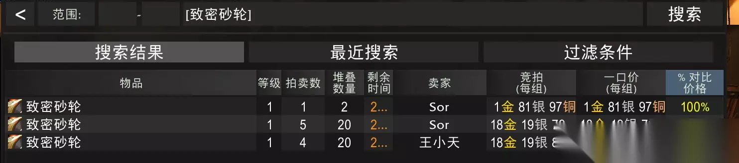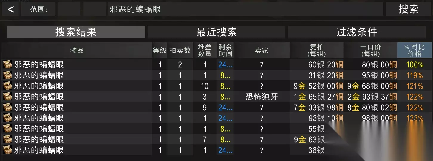不同等级的任务 我们直接说最高级任务即可,一次可以获得20奖券,我们需要完成60次5层任务。 4个NPC对应的5层任务是 6个瑟银零件/8个致密砂轮/8个毛皮护甲片/10个发光的蝎血/10个邪恶的蝙蝠眼 我到我们服的AH都搜了一遍,如下图
