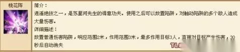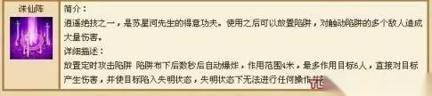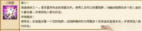 逍遥派技能,是苏星河先生的得意功夫。 使用之后可以放置陷阱,对触动陷阱的多个敌人造成大量伤害。 天龙八部中最为技能的技能之一.