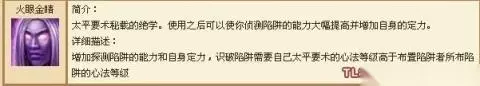 火眼金睛,使用之后可以使你侦测陷阱的能力大幅提高并增加自身的定力 天龙八部中最为鸡肋技能之一。