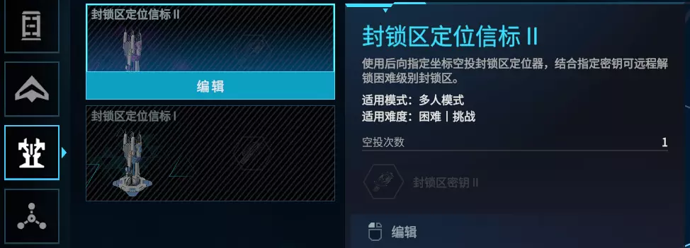 【封锁区定位信标】分为Ⅰ、Ⅱ、Ⅲ三种等级,需要对应等级的【封锁区密钥】进行装配。Ⅱ级信标只可在困难、挑战难度使用;Ⅲ级信标只可在挑战难度使用。