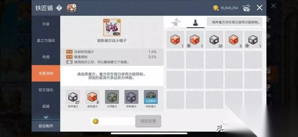 远征分普通和试炼两种,奖励不同,然后想说的是装备,除了升级和强化星之力,装备还有变更潜能的方式进行提升。 变更潜能需要用到魔方:怪异魔方、超级魔方和终极魔方。怪异魔方因为潜能升品的概率较低,建议用超级魔方来洗品质,从稀有到史诗再到神器。 到达神器后,使用怪异魔方洗,争取更好的属性提升战力。