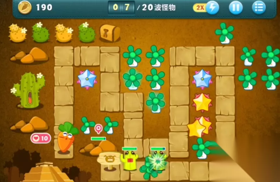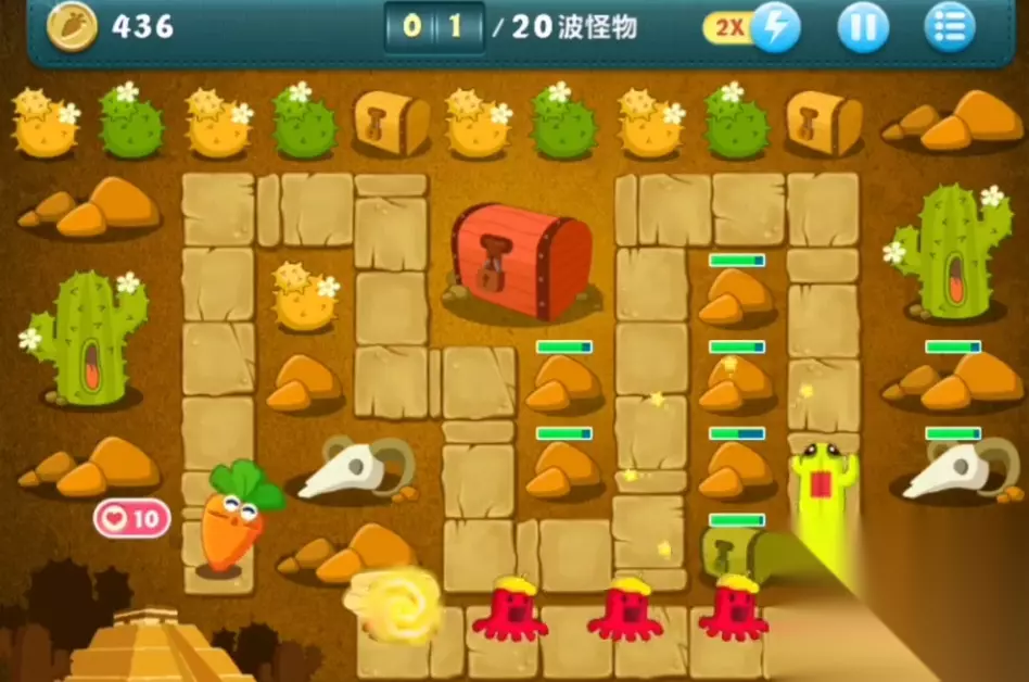 这关可以使用的炮塔只有瓶子炮、便便塔和炸弹星,可以使用的炮塔只有炸弹星一个,所以我们开局先在地图的右下角处建造一个三级的炸弹星,并锁定攻击左上方的褐色石头。如果有怪物接近,就取消锁定,让炸弹星将怪物给消灭掉。按照这种打法,可以在第二波开始的时候,将这个石头给清理掉。然后我们在此处再建造一个三级的炸弹星,并和右下角的炸弹星一起攻击下方的宝箱。