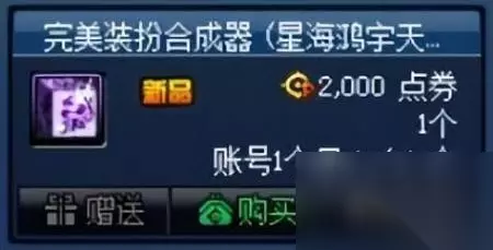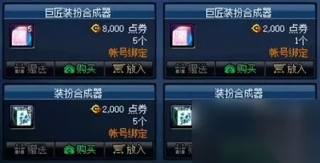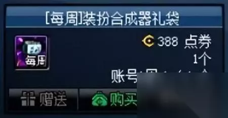 每周限购一次的装扮合成器礼袋,售价388点券,打开礼袋后可以从普通、黄金、巨匠以及合装扮成器中随机获得一种,即使是开出最普通的装扮合成器,也比直接购买要便宜很多,性价比很高,不过不能使用代币券进行购买。