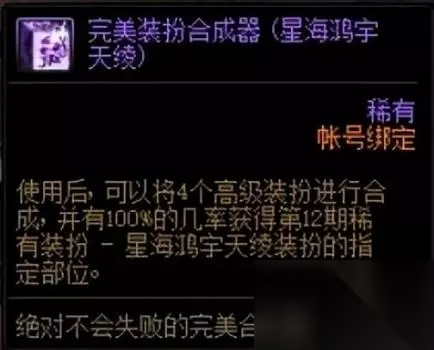 目前常规的合成器分为三种,分别是装扮合成器、黄金装扮合成器以及巨匠装扮合成器,此外还有一种消耗4个装扮合成出指定部位稀有装扮的装扮合成器,稀有装扮合成概率如下图所示: