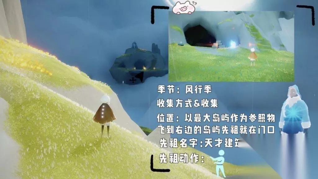 4、第四个:天才建筑者 季节:风行季 收集难度:简单 地区:雨林&风之大道 详细位置:以最大岛屿作为参照物飞到右边的岛屿先祖就在门口