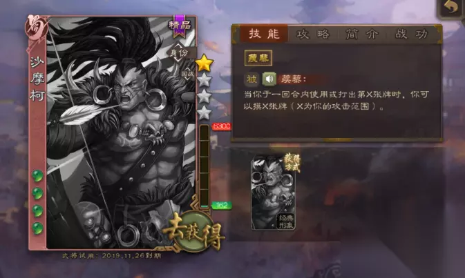 2、沙摩柯:全模式通用,价格为5000将魂,有强势的过牌技能,但是美中不足就是过牌质量很差。