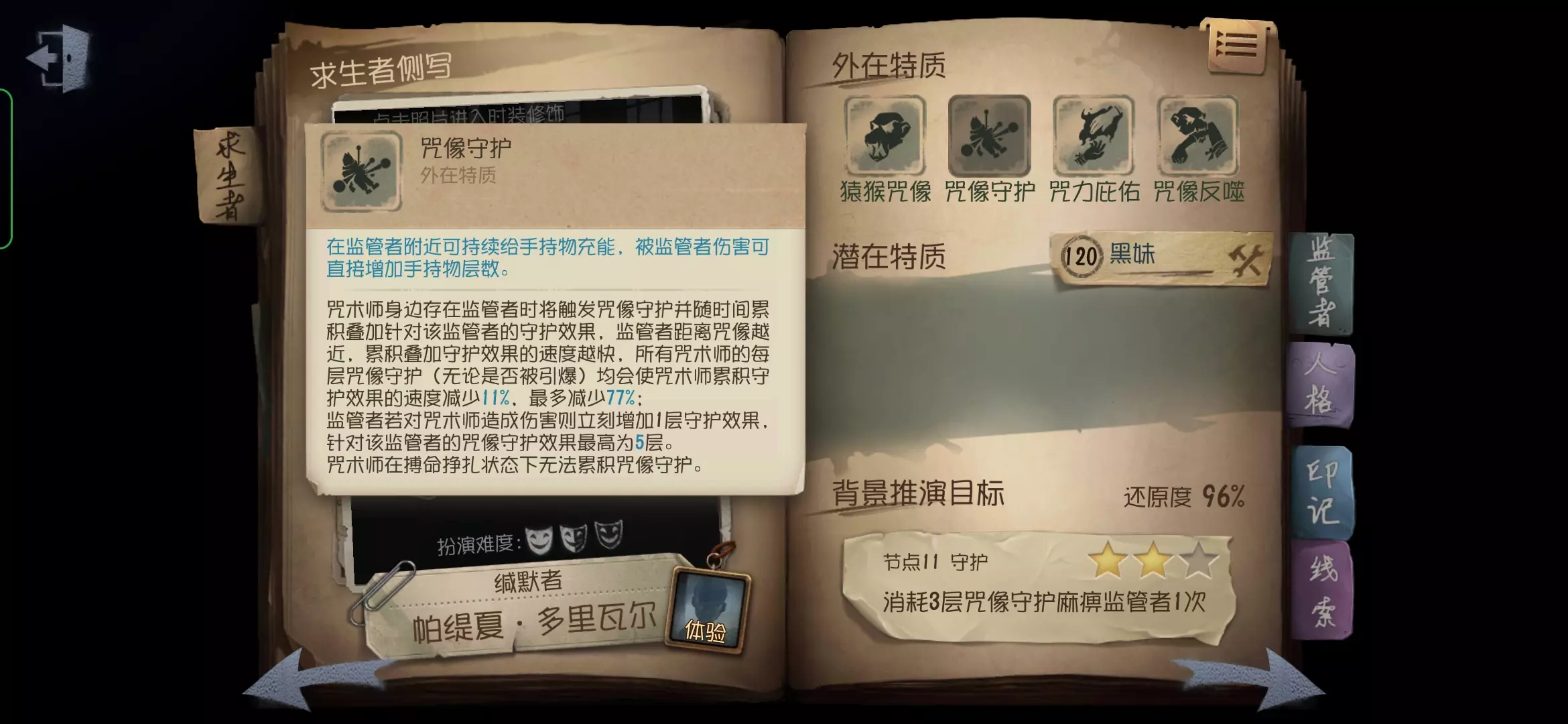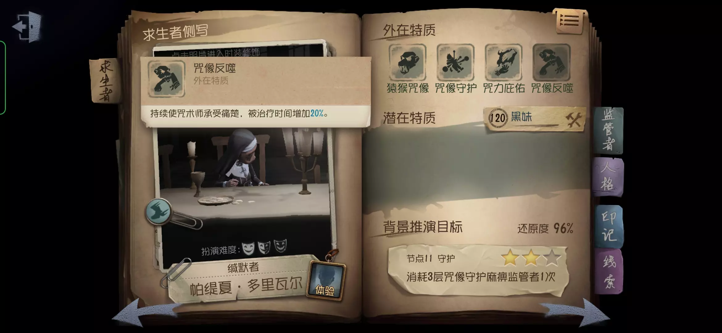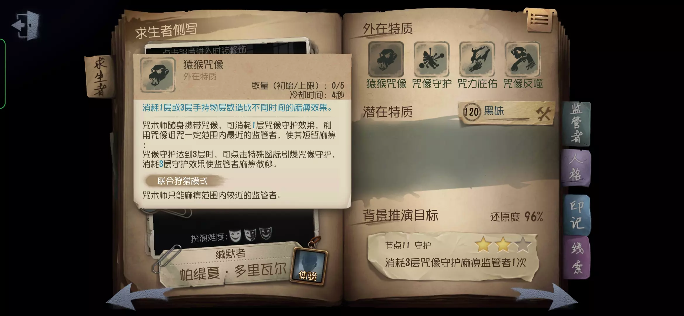 咒术师的角色定位是牵制及辅助干扰位,咒术师在一定范围内存在监管者时,可以持续获得猴头咒术,咒术可以对监管者进行短暂晕眩,以此拉开自身与监管者的距离,达到牵制的效果