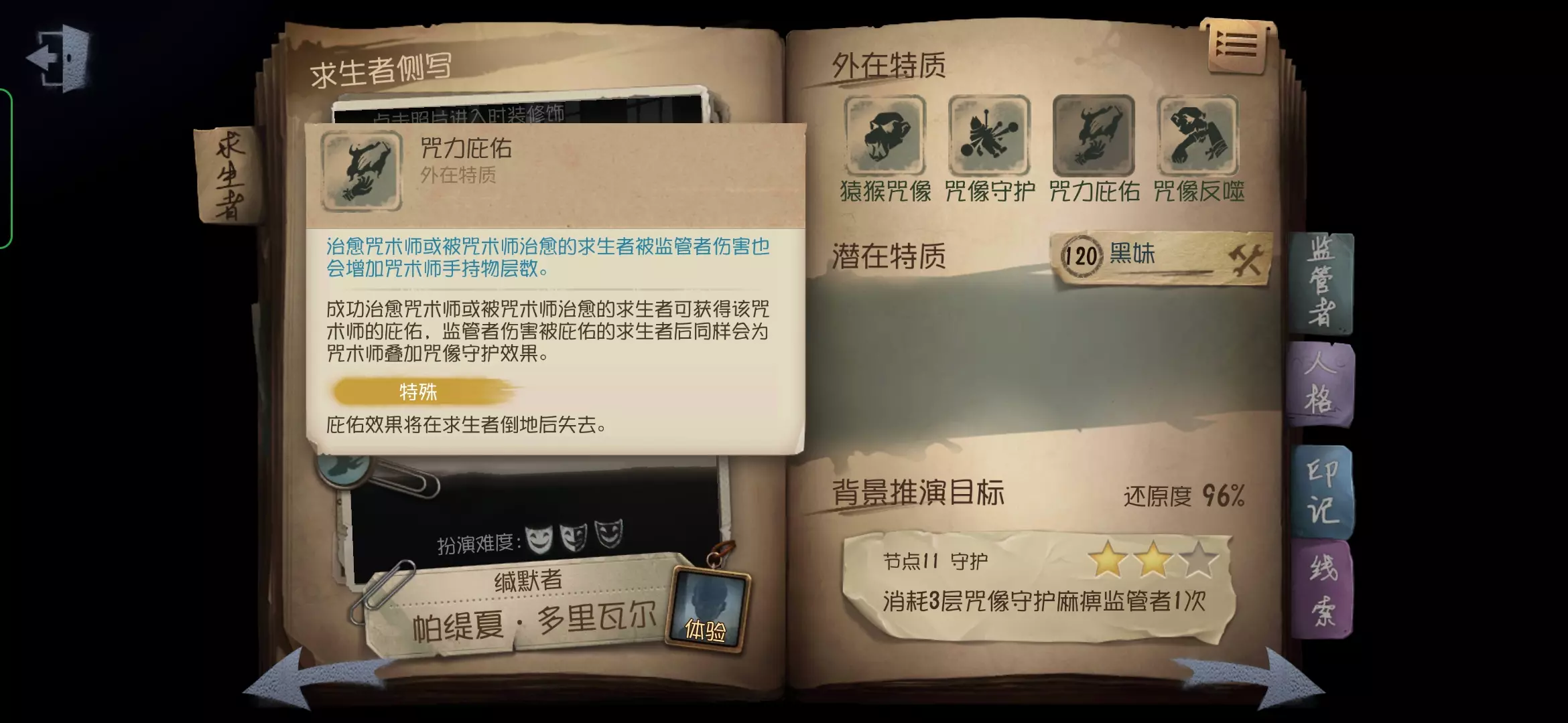 当监管者对拥有庇佑的求生者每造成一伤害,咒术师都可以立即获得一层咒术,但要注意的是,庇佑效果会在该求生者倒地时消失