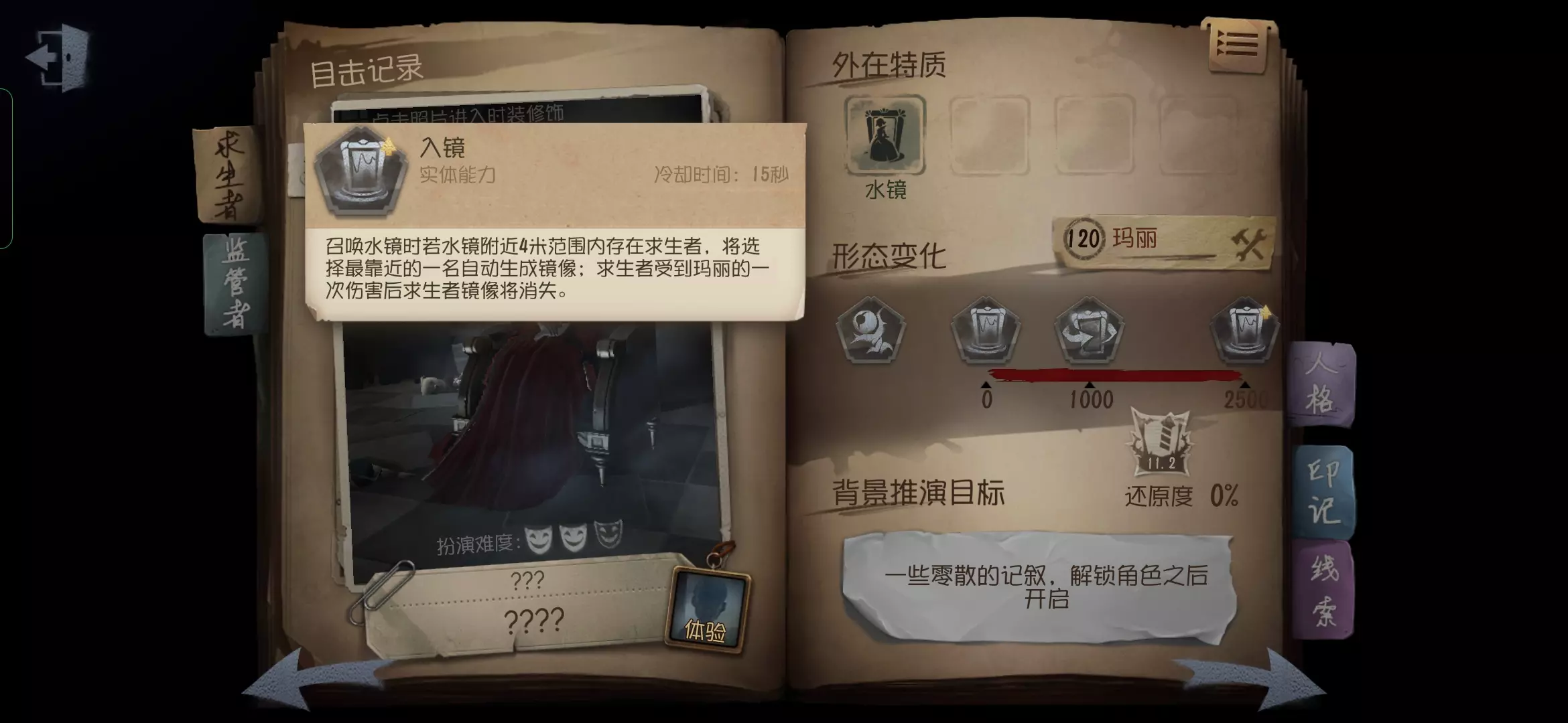红夫人可以放置镜子并形成镜像,镜像无视碰撞且可以实时反映本体的位置,状态与动作,镜像在求生者周围时还可以看见求生者的轮廓并对求生者造成伤害,但一名求生者在同一时间最多承受一次伤害,0阶时的红夫人在八秒的冷却时间后,可以向指定地点放出一个存在13秒的水镜,并且召唤出一个以水镜为中轴与本体对称的镜像,镜像攻击求生者可以对求生者造成伤害,在镜像存在时再次点击技能键,还可以与镜像互换位置,不过,每个镜像施放后,只可以一次互换,镜子结束后需要15秒冷却才可以再次释放