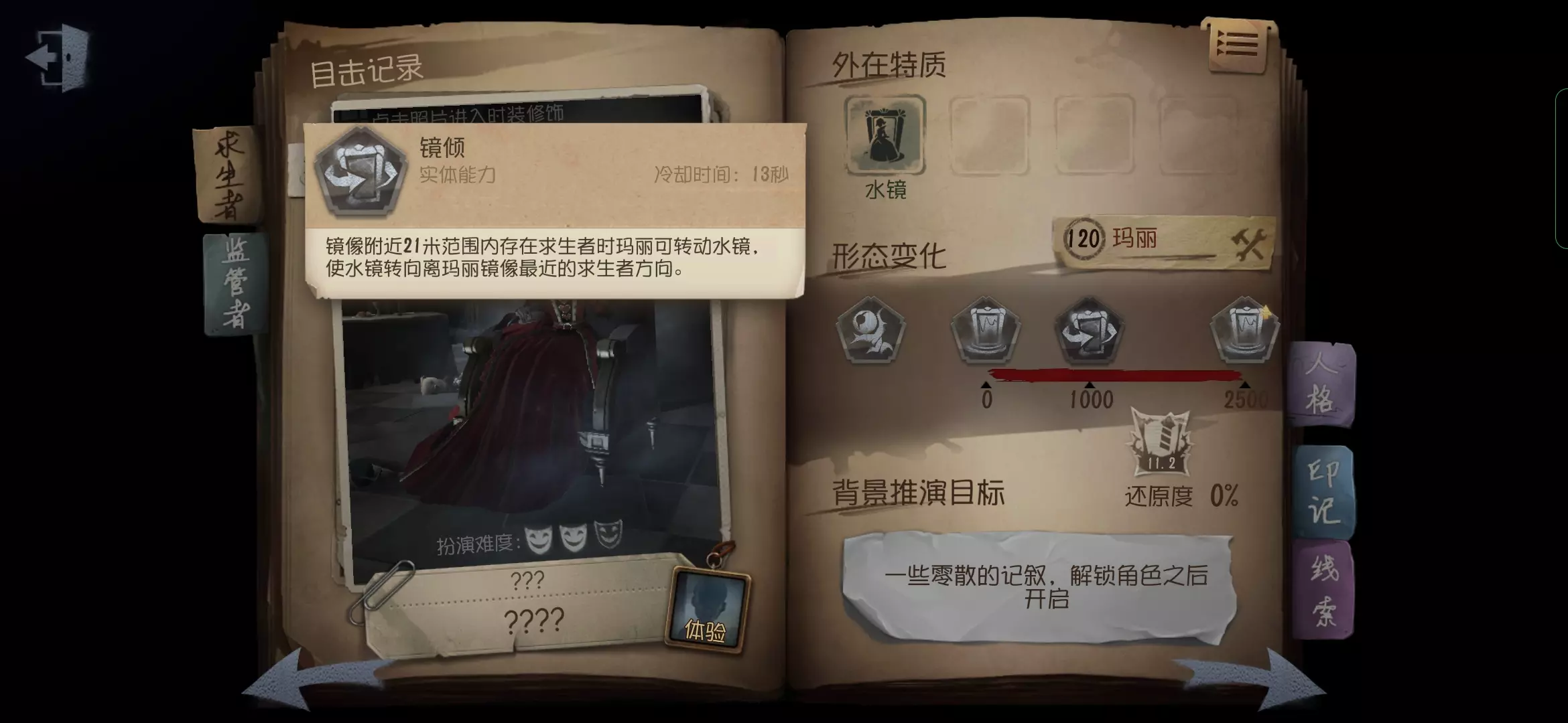 1阶时的红夫人会解锁镜倾技能,当镜像附近20米范围内存在求生者时,红夫人可以转动水镜,使水镜转向离镜像最近的求生者方向,镜倾的冷却时间为13秒,每次水镜存在时可以使用一次镜倾,镜倾可以让镜像移至离求生者最近的位置,增加攻击命中的机会,或者用来排查躲藏起来的求生者位置,例如,缩小的冒险家