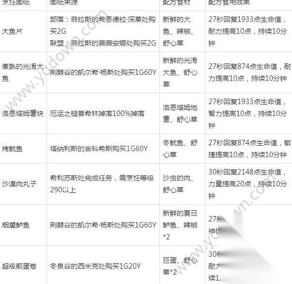 这里有 3 个地方需要跑腿,一个是高级烹饪技能书书需要去葬影村购买(也可在AH买),一个是大师级烹饪任务要去加基森交(提前买好任务物品),一个是去藏宝海湾港务局里买的一张食谱:油炸红腮鱼(售价1g44y ,也可以在AH买)。加基森大师级烹饪任务所需材料:美味蚌肉*12、奥特兰冷洛*20、巨蛋*12。建议提前备好食材以免重复跑路。 第二部分:烹饪图纸大全 烹饪练到300级了,那么烹饪到底有什么用呢?其实烹饪的产物和炼金产物差不多,只不过没有炼金产物加的属性多而已,但其可以和炼金药物共同使用,下面我们来看一下一下常用的烹饪大全: